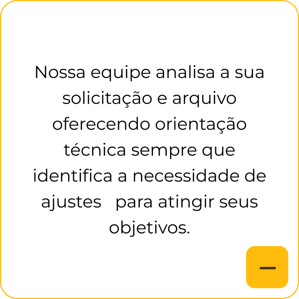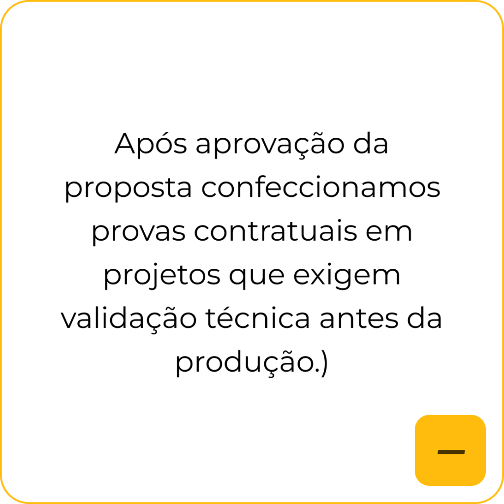 Análise técnica do projeto, com suporte desde a cotação até a entrega, garantindo alinhamento entre especificações, produção e prazos.