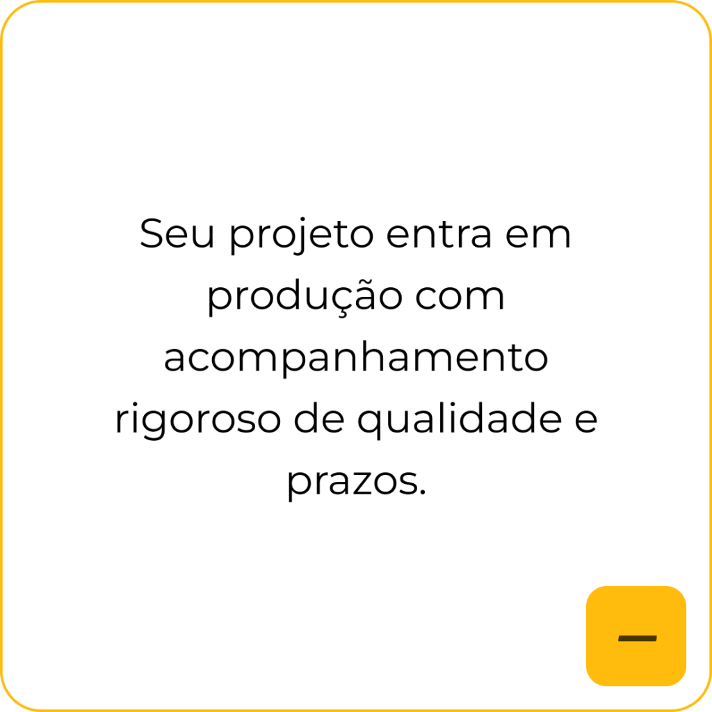 Os prazos variam de acordo com a complexidade e volume do projeto. Utilizamos software de PCP para garantir organização e cumprimento rigoroso dos prazos acordados.