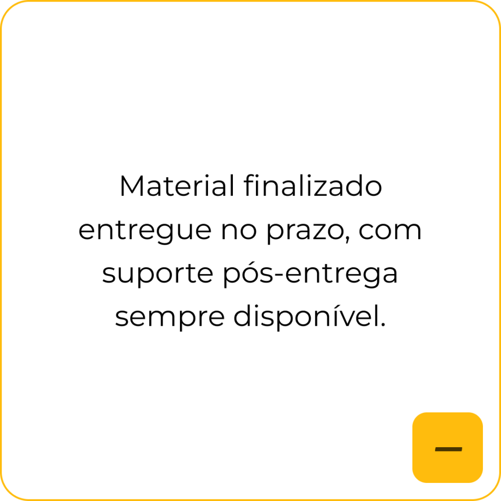 Nossa estrutura é voltada para atender demandas corporativas e de médio a grande volume. Para projetos menores, consulte nossa equipe sobre viabilidade.